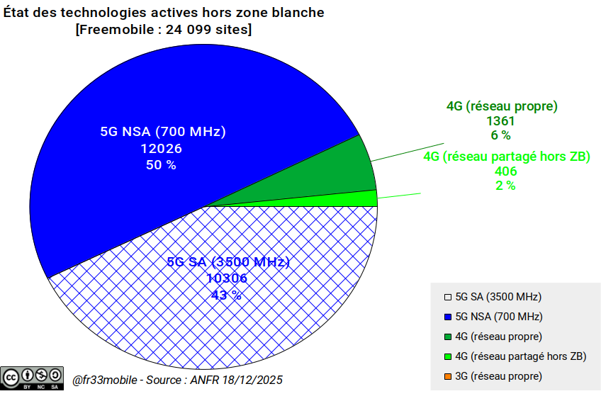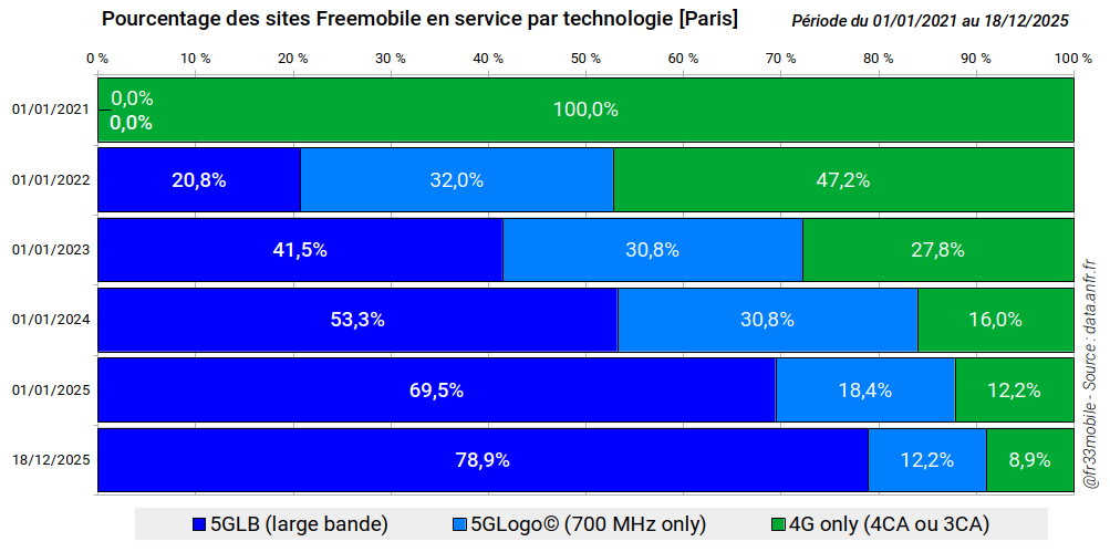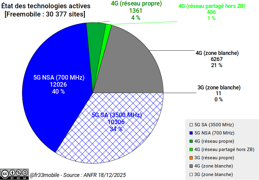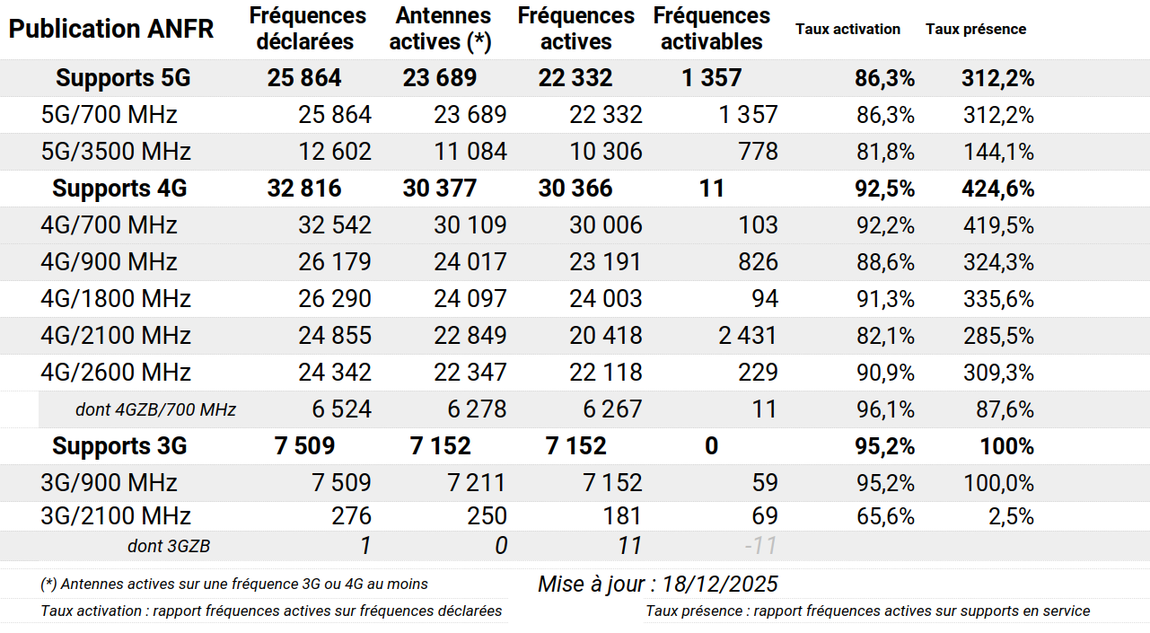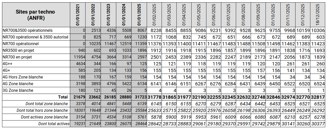Au 18 décembre 2025, 81,4% des sites étaient équipés et 11,8% étaient susceptibles de bénéficier, en zone dense, de l'effet "intersite", soit ~93% des sites capables de distribuer un débit variant de 650-850 Mbps en intersite à 1,8 Gbps pour un site intégrant les technologies les plus performantes.