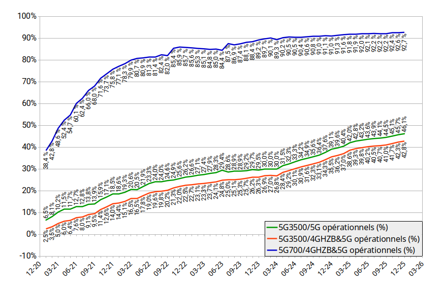 L'objectif de 3000 sites émettant dans la fréquence 3,5 GHz à partir du 31 décembre 2022 a été largement respecté avec 4337 antennes en service à cette date.