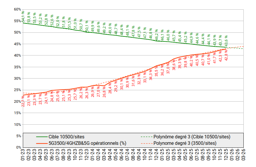 Courbe bleue : Les 8000 sites à activer en 3500 MHz au 1er janvier 2025 représentaient 41,2% des sites actifs au 1er janvier 2023. Ils ne représentent plus que 37,1% en raison de la politique active de déploiement de nouveaux sites (dont un sur trois équipé en 3500 MHz).