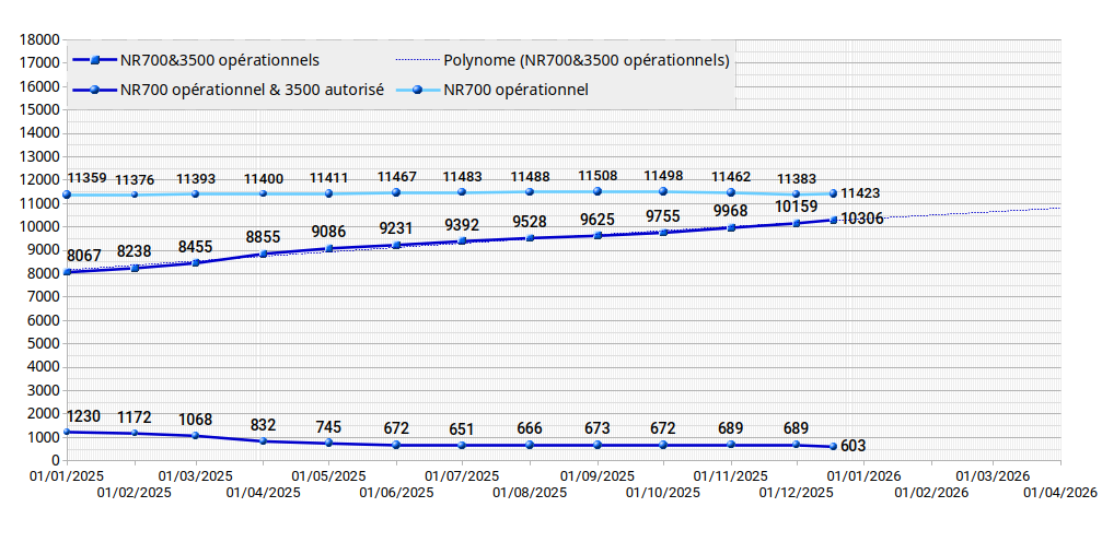 Les graphiques ci-dessus sont basés sur les fichiers ANFR publiés sur une base hebdomadaire et non sur la version papier. A titre indicatif, le dernier graphe établi à partir de la version papier publiée mensuellement figure ci-dessous :
