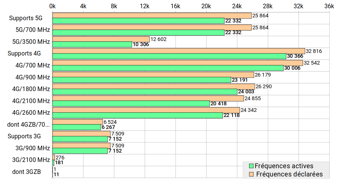 On notera, pour 3 des 4 opérateurs, les milliers de sites incapables de délivrer plus de 240 Mbps [entre 1465 sites pour Orange et 2879 pour Bouygues], soit un débit inférieur à celui disponible en zone blanche. Ces sites devront être upgradés en totalité avant le 31/12/2030 selon les obligations de l'ARCEP. Sur les 240 sites de Freemobile dans cette situaton, seuls 33 ne sont pas situés en zone blanche.