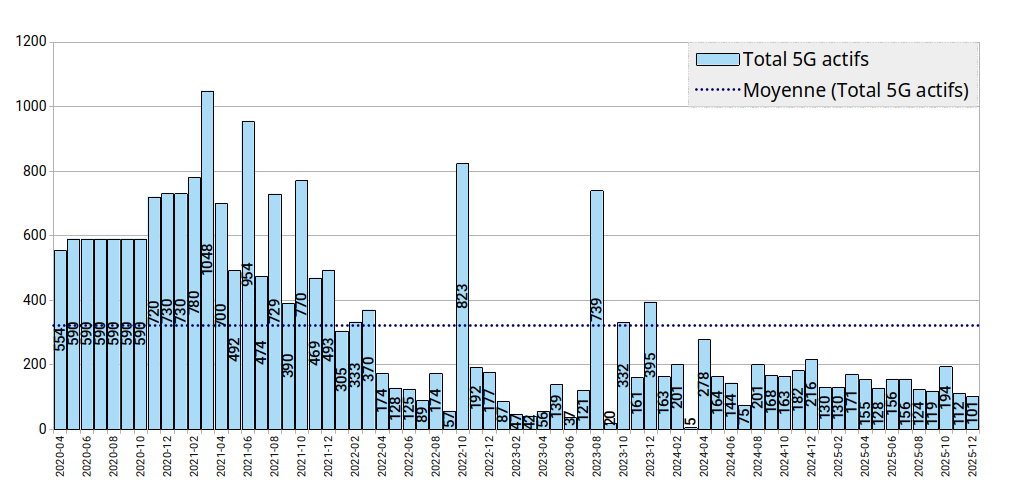 NB : Ce graphe est privilégié par rapport au graphe ne montrant qu'une évolution globale sans faire apparaître l'effet des deux composantes du déploiement de la 5G large bande (nouveaux sites équipés vs simple upgrade).